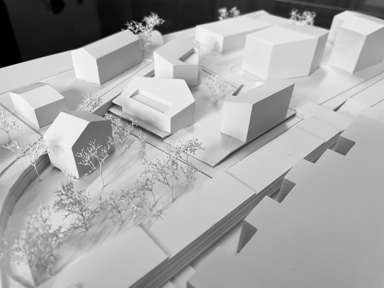 Der zu betrachtende Bauplatz spielt eine besondere Rolle im städtebaulichen Umfeld mit einer sehr heterogener Körnung. Die vorgeschlagenen Baukörper bilden hinsichtlich ihrer Größe und Geometrie einen fließenden Übergang von der grobkörnigen, südlichen Bebauung mit hoher Dichte und der nord- östlich gelegenen kleinteiligen Siedlungsstruktur. Die dynamische Ausrichtung der Gebäude und die geneigten Pultdächer bilden eine markante Shilouette des Gebäudeensembles, die unterschiedliche und prägnante Ansichten/Perspektiven der Wohnanlage aus den verschiedensten Standpunkten, im Speziellen von der westlichen Ortseinfahrt und der westlichen Zentrumsausfahrt bietet.